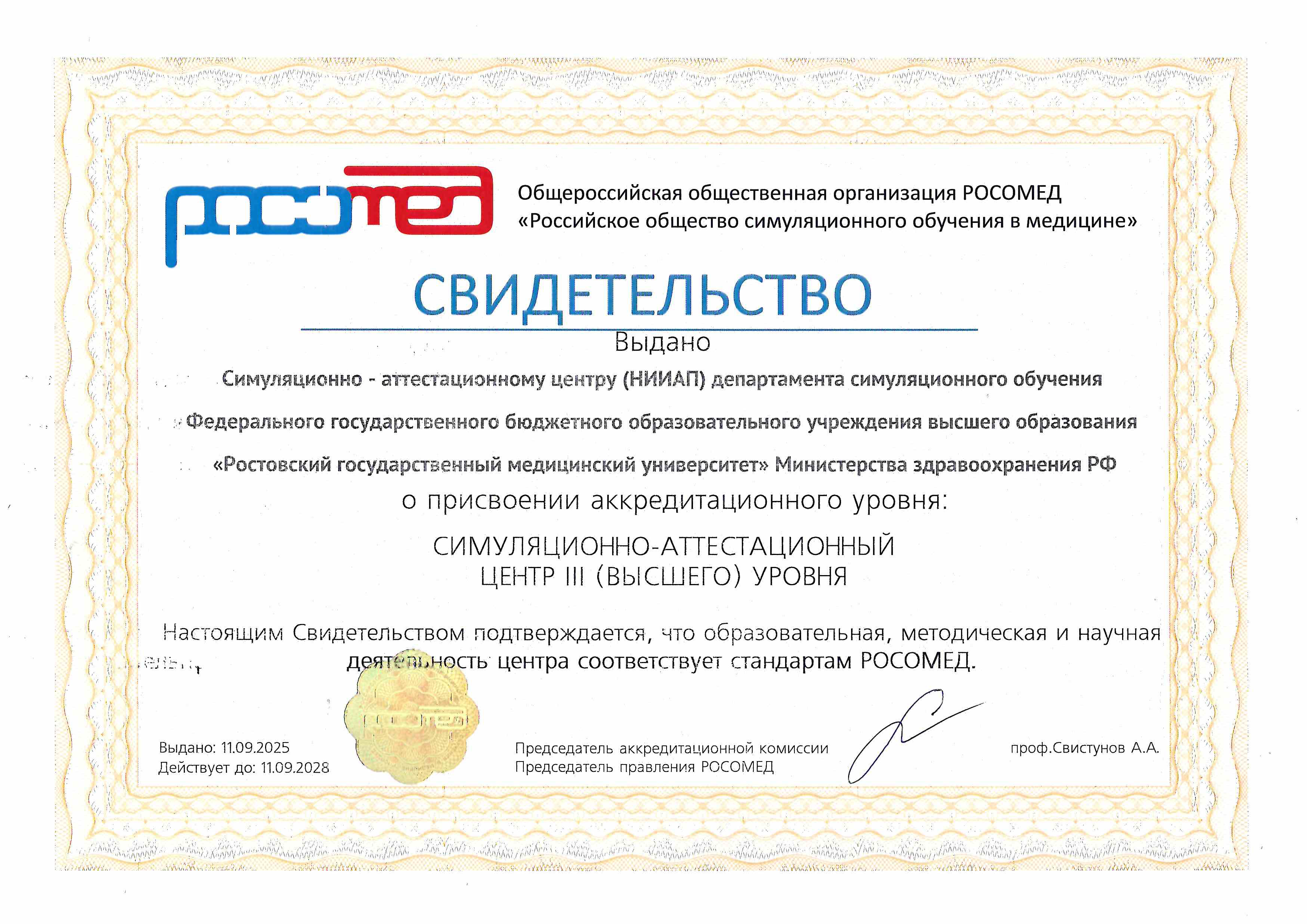 В 2025 г. проведена акреаккредитация центра Российским обществом симуляционного обучения в медицине (РОСОМЕД) с подтверждением аккредитационного уровня: СИМУЛЯЦИОННО-АТТЕСТАЦИОННЫЙ ЦЕНТР III (высшего) УРОВНЯ.